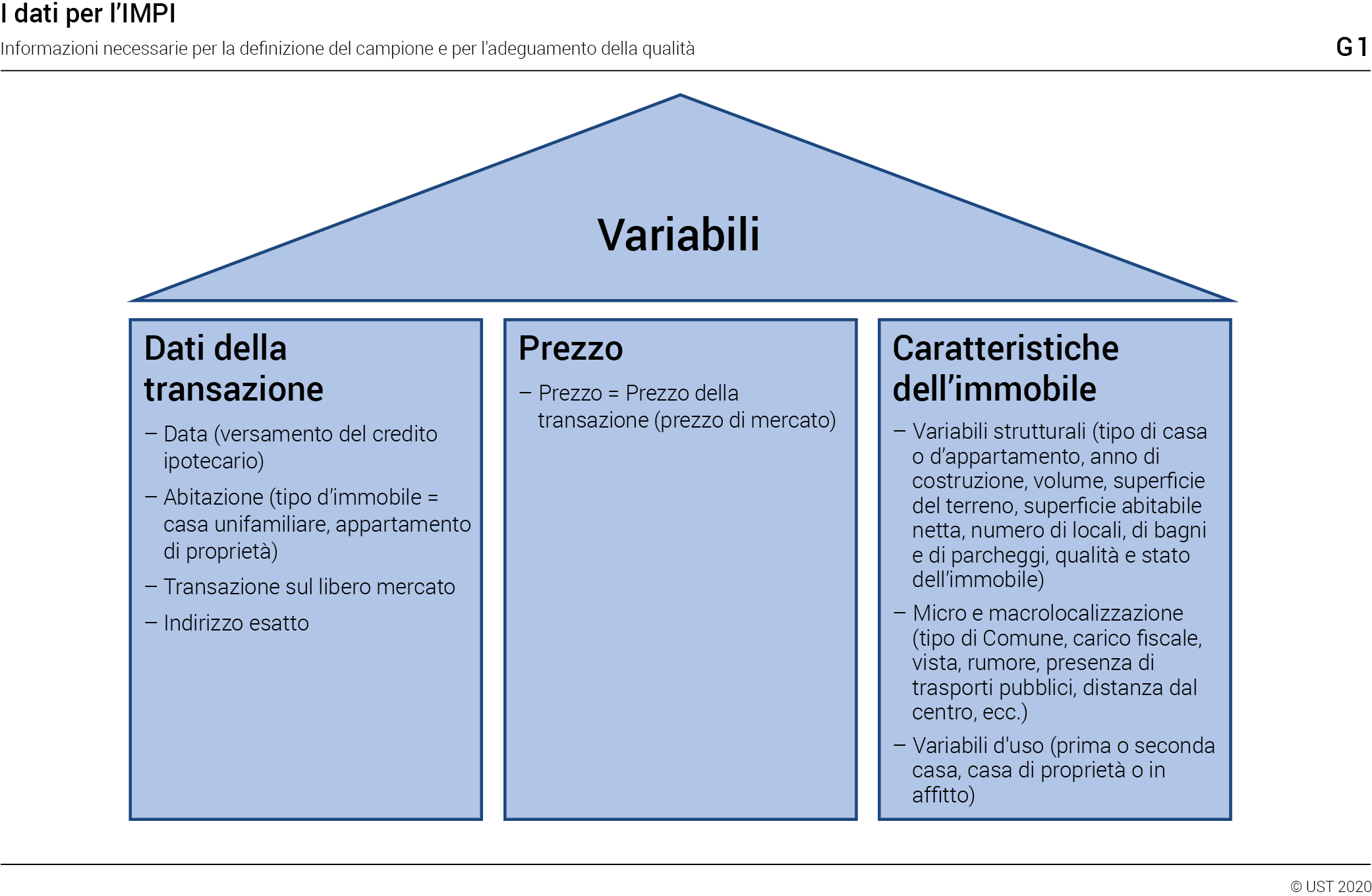 Per delineare l’andamento dei prezzi nel corso del tempo, l’UST necessita quindi di un insieme di informazioni: innanzitutto occorre sapere quali immobili sono stati venduti in quale data. Bisogna poi accertarsi che si tratti del tipo di immobile corretto e che il prezzo di acquisto sia un prezzo di mercato. All’UST servono infine una serie di dati relativi alle caratteristiche delle case unifamiliari e degli appartamenti di proprietà venduti (figura G1) Informazioni precise sull’espressione delle variabili di transazione, indirizzo, struttura, utilizzo e localizzazione (formato, categorie) sono disponibili anche al seguente sito Internet: https://github.com/bfs-preis/impi/wiki .