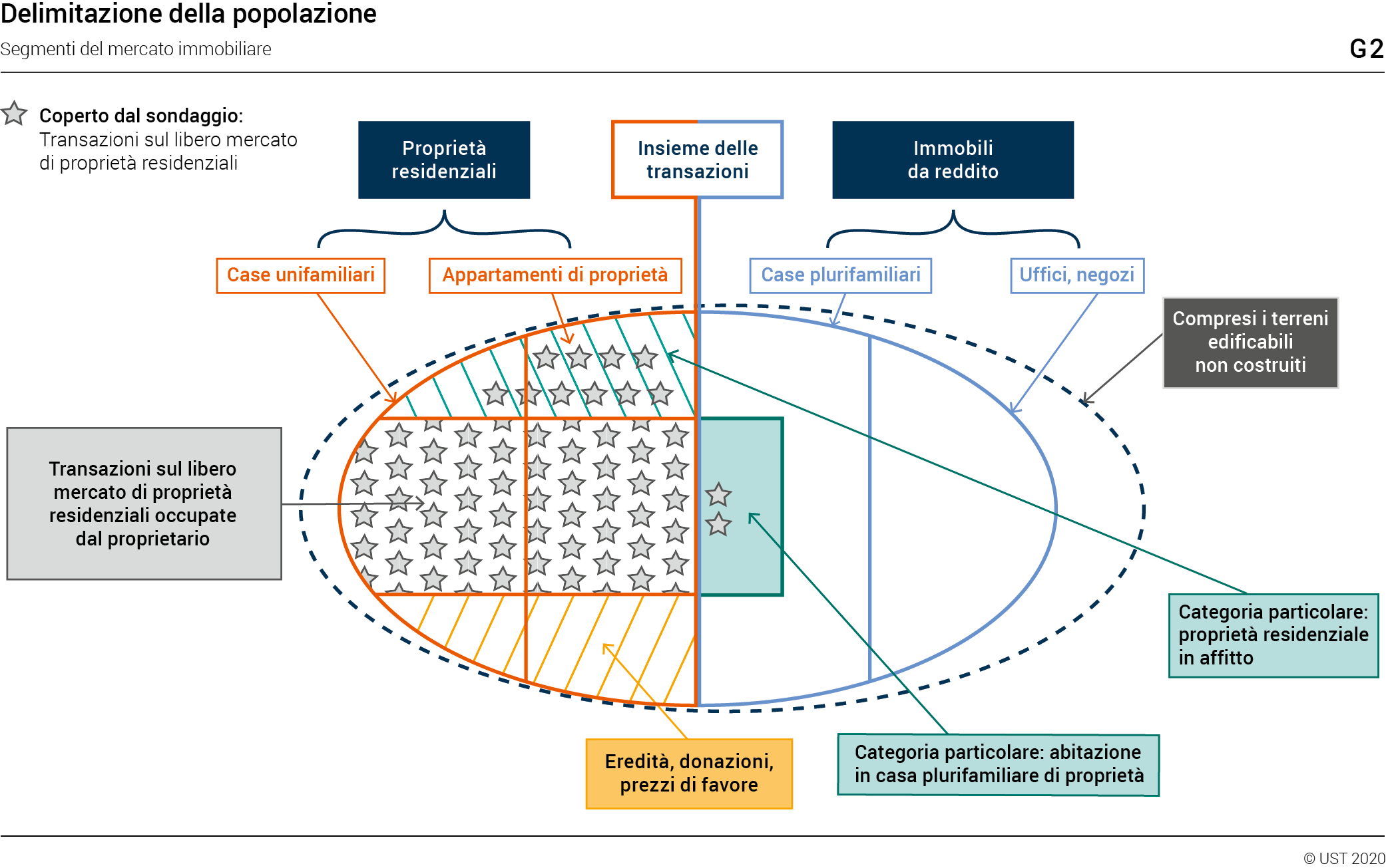 Nella rilevazione l’UST è informato sulla possibilità che una casa unifamiliare o un appartamento sia destinato dal proprietario «all’uso proprio» o «all’affitto». Tuttavia, non tutti i fornitori di dati sono in grado di trasmettere all’UST la suddetta informazione. Il numero delle transazioni è insufficiente per calcolare separatamente l’andamento dei prezzi in entrambi i segmenti immobiliari Si riscontra un interesse in questo senso da parte dell’industria degli immobili e anche a livello internazionale (p. es. da parte di Eurostat). L’intento è quello di osservare se si verificherà un’eventuale suddivisione del mercato immobiliare residenziale in un segmento composto dalle abitazioni di proprietà destinate all’uso proprio e un altro formato dalle case unifamiliari e dagli appartamenti acquistati da investitori privati unicamente a scopo di investimento. . È invece completo, poiché compare in tutto il campione, il dato che indica se il proprietario utilizza l’immobile come «abitazione primaria» o «secondaria». Il tipo di utilizzo dell’immobile residenziale è rilevante nei Comuni in cui la quota di abitazioni secondarie raggiunge o supera il limite del 20%. In queste località ci si può aspettare una dicotomia del mercato immobiliare.