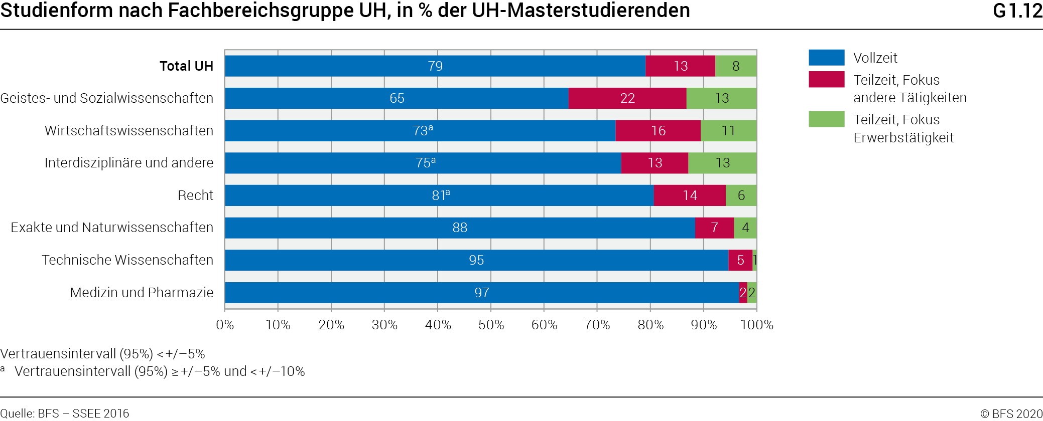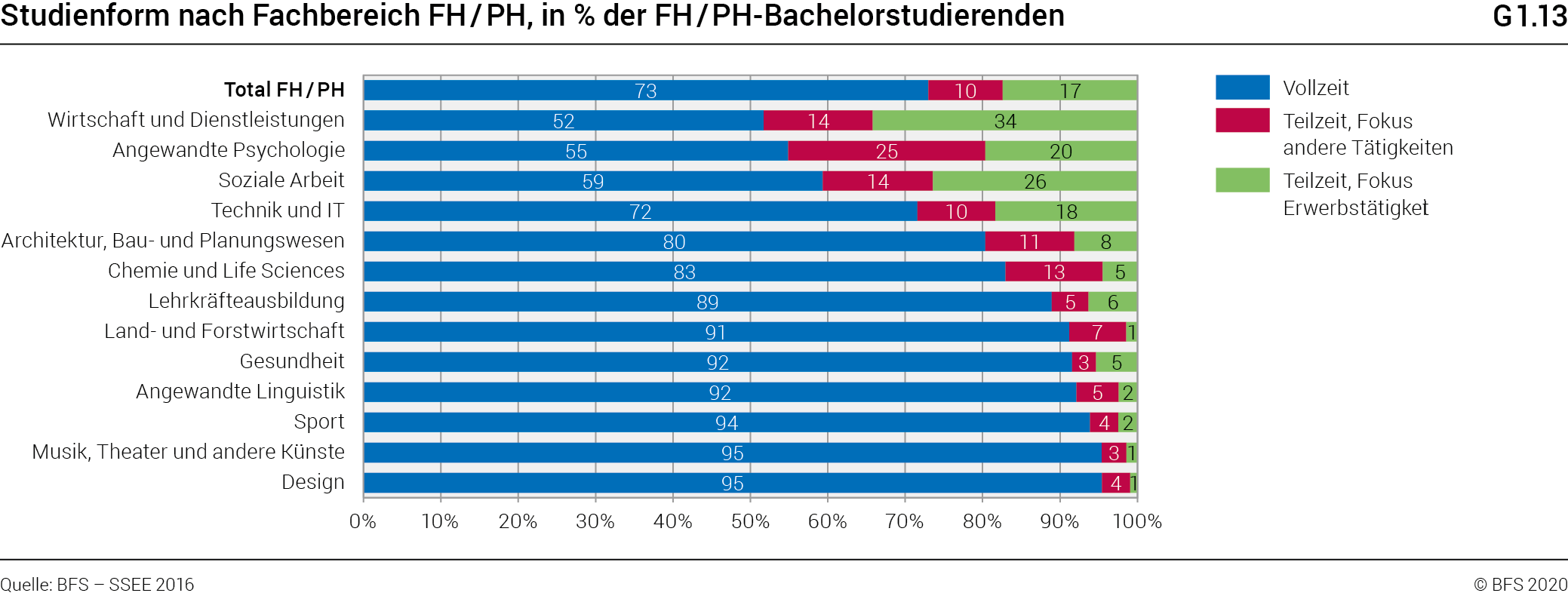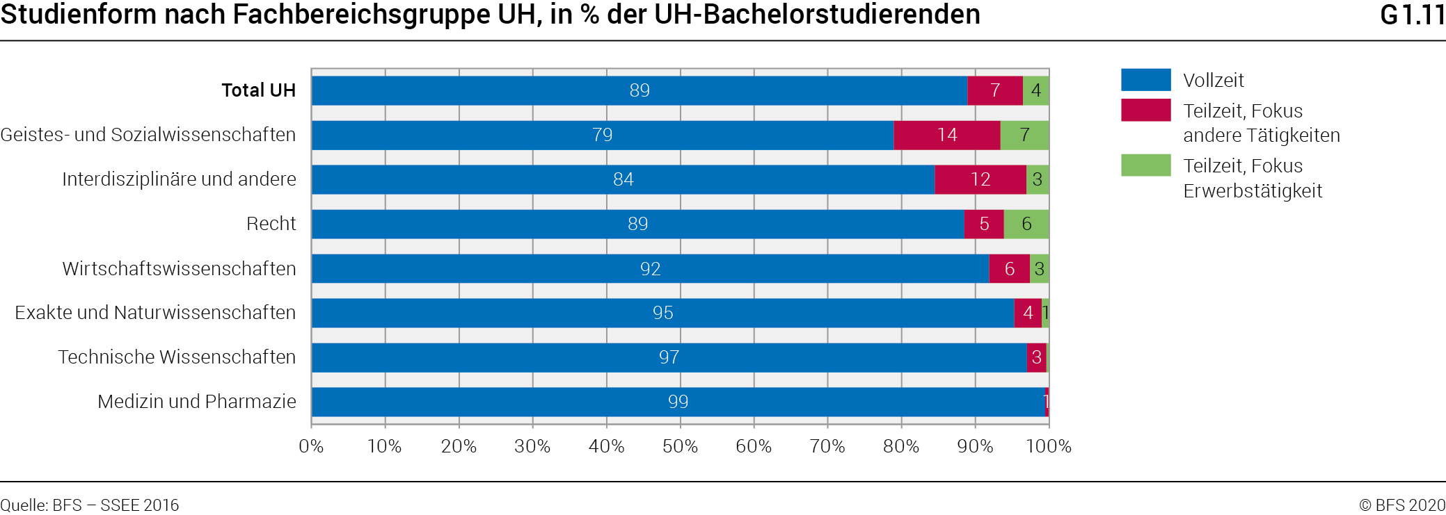 Die Studienform unterscheidet sich je nach UH-Fachbereichsgruppe und FH/PH-Fachbereich. Bei den UH-Bachelor-Studierenden sind Vollzeitstudierende in den Fachbereichsgruppen Medizin und Pharmazie (99%), Technische Wissenschaften (97%) sowie Exakte und Naturwissenschaften (95%) gemessen am UH-Durchschnitt (89%) übervertreten. In den Geistes- und Sozialwissenschaften (79%) sind sie hingegen untervertreten. Bei den UH-Masterstudierenden verhält es sich sehr ähnlich wie bei den UH-Bachelorstudierenden. Geistes- und Sozialwissenschaften weisen sowohl auf Stufe Bachelor als auch auf Stufe Master einen grösseren Anteil Teilzeitstudierende mit Fokus andere Tätigkeiten auf als Teilzeitstudierende mit Fokus Erwerbstätigkeit.