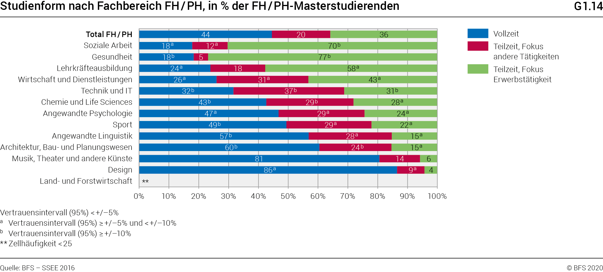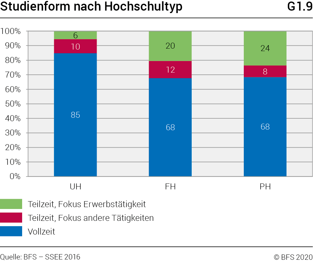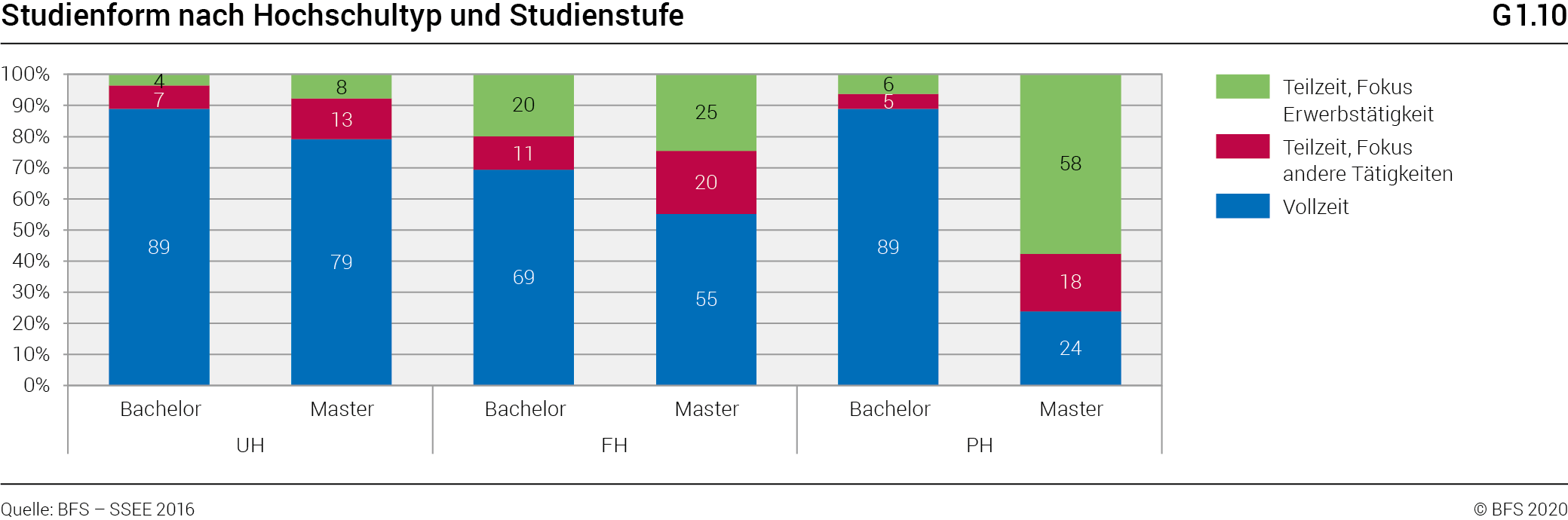 Die Studienform unterscheidet sich je nach UH-Fachbereichsgruppe und FH/PH-Fachbereich. Bei den UH-Bachelor-Studierenden sind Vollzeitstudierende in den Fachbereichsgruppen Medizin und Pharmazie (99%), Technische Wissenschaften (97%) sowie Exakte und Naturwissenschaften (95%) gemessen am UH-Durchschnitt (89%) übervertreten. In den Geistes- und Sozialwissenschaften (79%) sind sie hingegen untervertreten. Bei den UH-Masterstudierenden verhält es sich sehr ähnlich wie bei den UH-Bachelorstudierenden. Geistes- und Sozialwissenschaften weisen sowohl auf Stufe Bachelor als auch auf Stufe Master einen grösseren Anteil Teilzeitstudierende mit Fokus andere Tätigkeiten auf als Teilzeitstudierende mit Fokus Erwerbstätigkeit.