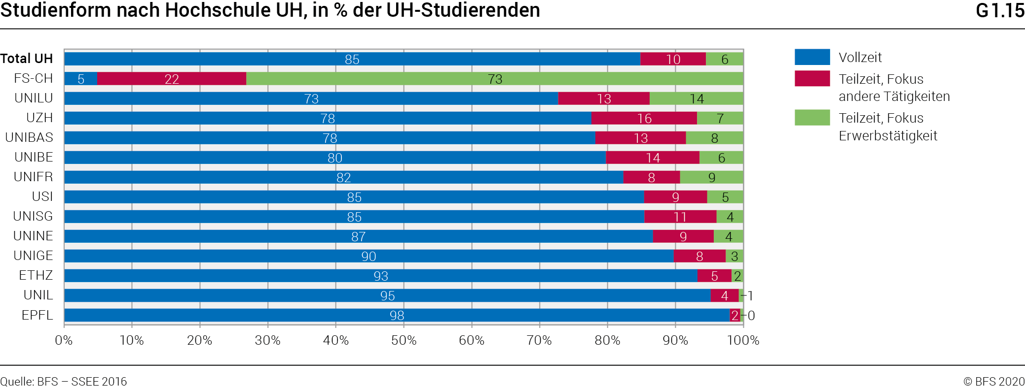 Bei den UH sind die Vollzeitstudierenden an der Eidgenössischen Technischen Hochschule Lausanne (EPFL), der Universität Lausanne (UNIL), der Eidgenössischen Technischen Hochschule Zürich (ETHZ) und der Universität Genf (UNIGE) übervertreten. Untervertreten sind sie hingegen an der Universität Luzern (UNILU), der Universität Zürich (UZH), der Universität Basel (UNIBAS) und der Universität Bern (UNIBE). Die universitären Fernstudien Schweiz (FS-CH) stellen betreffend Studienform einen Sonderfall dar, da die grosse Mehrheit der an dieser Hochschule immatrikulierten Personen Teilzeit studiert. Die Unterschiede zwischen den Hochschulen in der Westschweiz und denjenigen in der Deutschschweiz für ähnliche Resultate auf Basis der Daten des ASBOS-Projekts siehe BFS (2016): Studienintensität und studentische Mobilität. Studienjahre 2013/2014 und 2014/2015. Neuchâtel: BFS. Seite 12 sind auf institutionelle Faktoren (u. a. Angebot der Studienfächer an den Hochschulen) und auf die Merkmale der Studierenden (Durchschnittsalter an den Hochschulen, soziale Herkunft, Migrationshintergrund) zurückzuführen. Möglich wäre aber auch, dass bei den formellen Studienregelungen und dem Studienaufbau regionale Unterschiede bestehen. Diese müssten jedoch genauer untersucht werden.