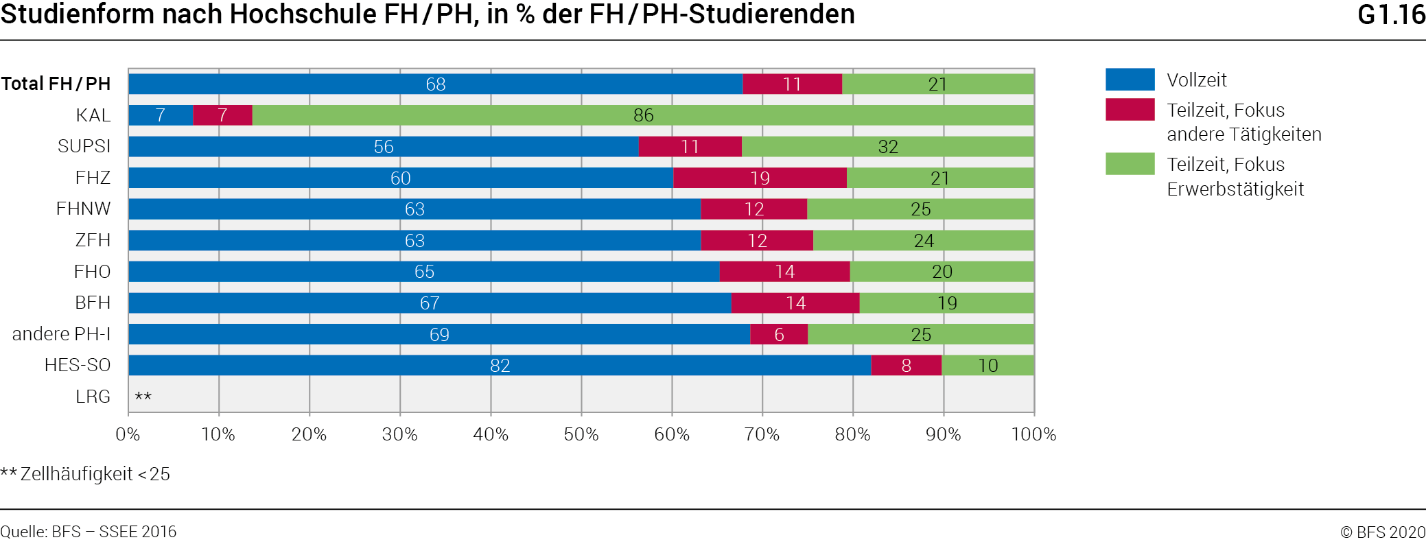 An den FH/PH sind die Vollzeitstudierenden einzig an der HES‑SO übervertreten. An der SUPSI sowie in geringerem Masse an der Fachhochschule Zentralschweiz (FHZ), der Fachhochschule Nordwestschweiz (FHNW) und der Zürcher Fachhochschule (ZFH) sind sie hingegen untervertreten. Die Kalaidos Fachhochschule (KAL) stellt einen Sonderfall dar, da die Studierenden dort grossmehrheitlich Teilzeit studieren. Auch bei den FH/PH lassen sich diese Gegensätze zwischen den Hochschulen in der Deutschschweiz und der SUPSI einerseits und der HES-SO andererseits teilweise mit den Altersunterschieden der Studierenden und dem Studienangebot erklären. Ein weiterer Grund sind regionale Unterschiede beim Studienaufbau.