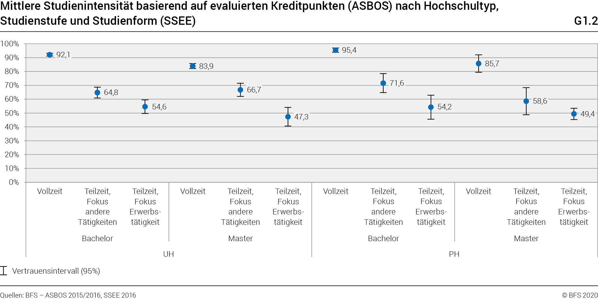 Das BFS führt seit 2013 das Projekt Anpassung der Studierendenstatistik an das Bologna-System (ASBOS). Damit können die Studienleistungen auf Basis der evaluierten ECTS-Kreditpunkte erfasst sowie die Studienintensität und die studentische Mobilität analysiert werden. Um die Stichhaltigkeit der für diesen Bericht definierten Typologie der Studienform zu überprüfen, wurden die Quellen ASBOS und SSEE miteinander verknüpft. Die Typologie der Studienform wurde dem ASBOS-Indikator Studienintensität gegenübergestellt. Dieser Indikator drückt die Studienintensität in Prozenten aus, wobei 100% einer Studienleistung von 30 ECTS-Kreditpunkten pro Semester entsprechen. Um die Studienintensität zu berechnen, wurde für jede studierende Person die Anzahl der von der Hochschule pro Semester evaluierten ECTS-Punkte durch 30 geteilt. Anschliessend wurde der durchschnittliche Prozentsatz berechnet, der die Studienintensität verschiedener Gruppen von Studierenden angibt. Der so ermittelte Indikator bezieht UH- und PH-Studierende ein, nicht aber FH-Studierende