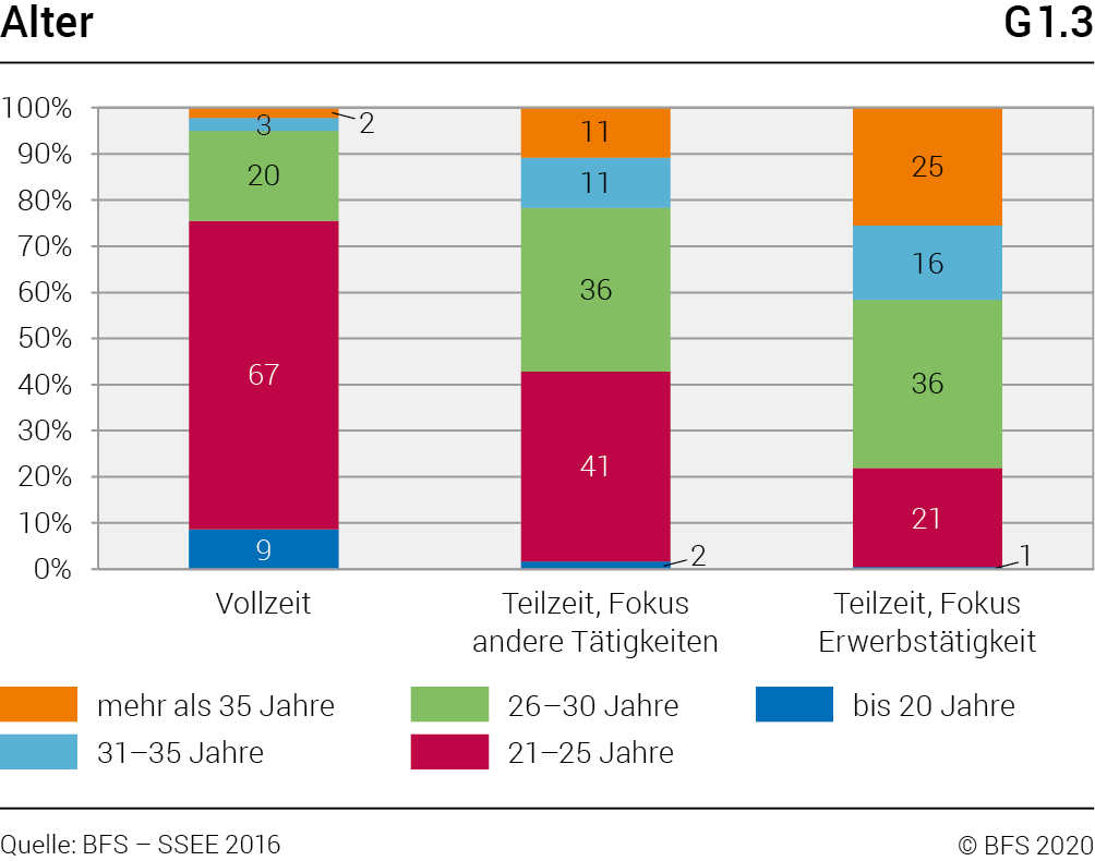 Die Altersstruktur variiert je nach Studienform sehr stark. Während die meisten Vollzeitstudierenden zwischen 21 und 25 Jahre alt sind, verteilen sich die Teilzeitstudierenden unabhängig vom Fokus gleichmässiger auf die Altersgruppen (21–25 Jahre bis über 35 Jahre). 67% der Vollzeitstudierenden sind zwischen 21 und 25 Jahre alt, bei den Teilzeitstudierenden mit Fokus andere Tätigkeiten fallen 41% in diese Altersgruppe, bei denjenigen mit Fokus Erwerbstätigkeit sogar nur 21%. Wie die folgenden Kapitel zum Zeitbudget, zur finanziellen Situation und zu den Lebensbedingungen zeigen, ist diese unterschiedliche Altersstruktur ein wichtiger Erklärungsfaktor für die Unterschiede zwischen den einzelnen Studienformen.