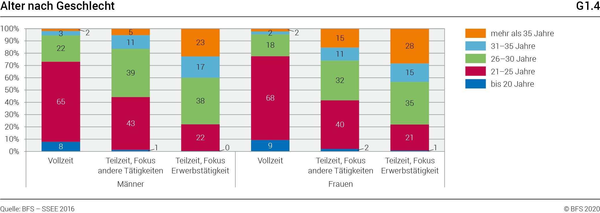 Kombiniert man das Geschlecht mit dem Alter (siehe Grafik G1.4), fällt auf, dass die Altersverteilung der Frauen und Männer in den einzelnen Studienformen in etwa gleich ist. Personen über 35 Jahre sind bei den Teilzeitstudentinnen allerdings deutlich stärker vertreten als bei den Teilzeitstudenten. Besonders gross ist der Unterschied in der Kategorie Teilzeit, Fokus andere Tätigkeiten. Dort sind 15% der Studentinnen und nur 5% der Studenten älter als 35 Jahre. Das heisst: Frauen ab 35 Jahren, die ein Studium beginnen oder wieder aufnehmen, tun dies häufiger auf Teilzeitbasis als Männer im gleichen Alter.