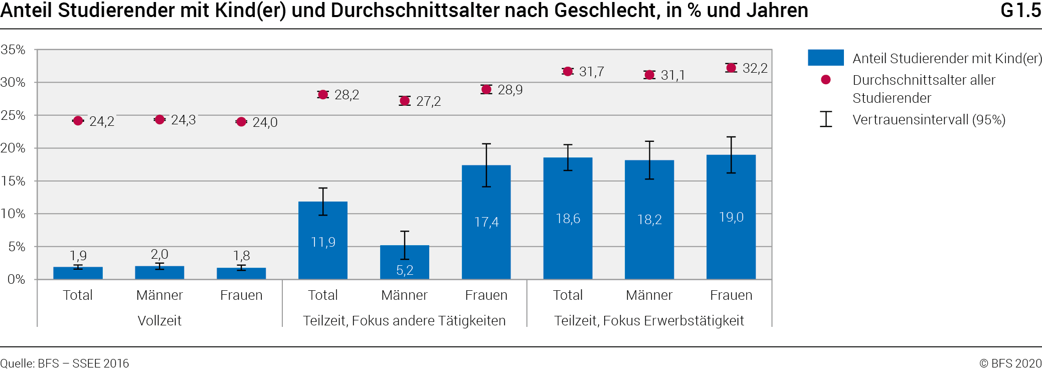 Bei den Teilzeitstudierenden mit Fokus andere Tätigkeiten haben Frauen mit 17,4% deutlich häufiger Kinder als Männer (5,2%). Bei den Teilzeitstudierenden mit Fokus Erwerbstätigkeit und bei den Vollzeitstudierenden unterscheiden sich Frauen und Männer bezüglich der Häufigkeit der Elternschaft nicht.