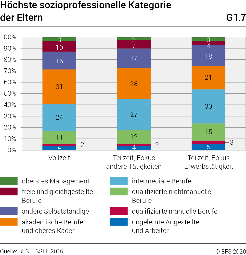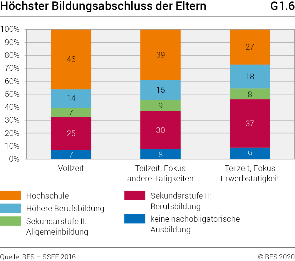 Allgemein haben die Eltern von Hochschulstudierenden verglichen mit der Wohnbevölkerung einen höheren Bildungsabschluss. siehe BFS (2017): Studien- und Lebensbedingungen an den Schweizer Hochschulen. Hauptbericht der Erhebung 2016 zur sozialen und wirtschaftlichen Lage der Studierenden. Neuchâtel: BFS. Seite 18;siehe auch BFS (2018): Lebenslanges Lernen in der Schweiz. Ergebnisse des Mikrozensus Aus- und Weiterbildung 2016. Neuchâtel: BFS. Seite 9 Es zeigen sich jedoch erhebliche Unterschiede nach Studienform. 46% aller Vollzeitstudierenden stammen aus Familien, in denen mindestens ein Elternteil über einen Hochschulabschluss verfügt. Bei den Teilzeitstudierenden mit Fokus andere Aktivitäten liegt dieser Anteil bei 39%, bei jenen mit Fokus Erwerbstätigkeit bei 27%. Der Anteil Studierender, deren Eltern als höchsten Bildungsabschluss eine berufliche Grundbildung der Sekundarstufe II aufweisen, verteilt sich hingegen umgekehrt. Bei den Teilzeitstudierenden mit Fokus Erwerbstätigkeit beträgt er 37%, bei den Teilzeitstudierenden mit Fokus andere Aktivitäten 30% und bei den Vollzeitstudierenden 25%. Aus diesen Ergebnissen kann geschlossen werden, dass Teilzeitstudierende, vor allem jene, deren Fokus auf der Erwerbstätigkeit liegt, aus einem weniger privilegierten sozialen Umfeld stammen als Vollzeitstudierende.