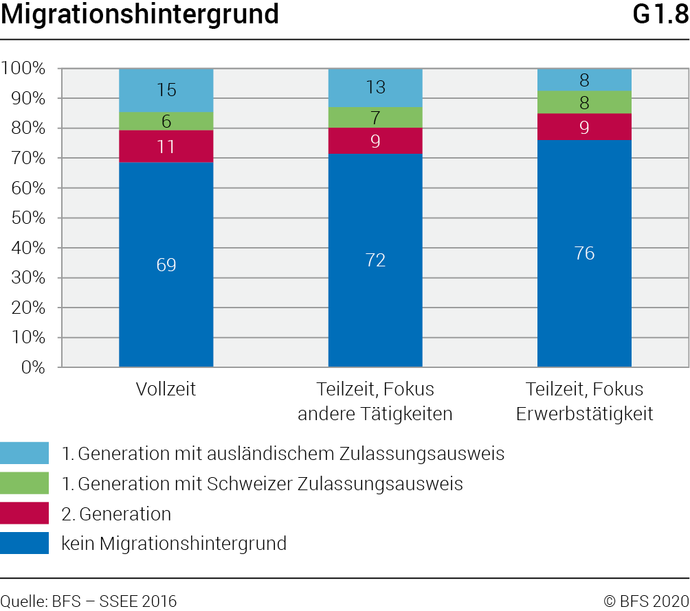 Der Migrationshintergrund der Studierenden unterscheidet sich leicht je nach Studienform. Im Ausland geborene Studierende der ersten Generation mit ausländischem Zulassungsausweis studieren häufiger Vollzeit (15%) als Teilzeit mit Fokus Erwerbstätigkeit (8%). Umgekehrt sind Studierende ohne Migrationshintergrund in der Kategorie Teilzeit, Fokus Erwerbstätigkeit (76%) häufiger vertreten als bei den Vollzeitstudierenden (69%). Zwischen dem Anteil Studierender ohne Migrationshintergrund der Gruppe Teilzeit, Fokus andere Tätigkeiten (72%) und den Vollzeitstudierenden (69%) oder der Gruppe Teilzeit, Fokus Erwerbstätigkeit (76%) besteht hingegen kein statistisch signifikanter Unterschied. Die Untervertretung der im Ausland geborenen Studierenden mit ausländischem Zulassungsausweis bei den Teilzeitstudierenden mit Fokus Erwerbstätigkeit hängt mit ihrem Migrationsverlauf zusammen. Oft sind sie zum Studieren in die Schweiz gekommen und beabsichtigen nicht, neben ihrem Studium zu arbeiten oder haben keine Arbeitsbewilligung. siehe BFS (2017): Studien- und Lebensbedingungen an den Schweizer Hochschulen. Hauptbericht der Erhebung 2016 zur sozialen und wirtschaftlichen Lage der Studierenden. Neuchâtel: BFS. Seite 41