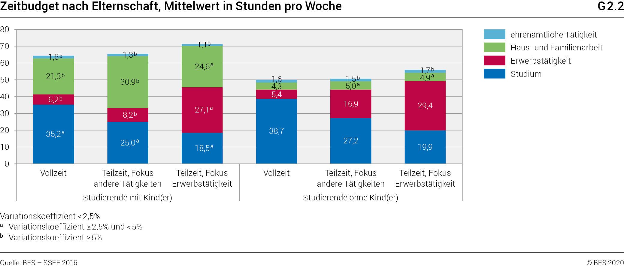 Generell steigt mit zunehmendem Alter der Studierenden auch die aufgewendete Zeit für Erwerbstätigkeit sowie Haus- und Familienarbeit an (sowie die zeitliche Gesamtbelastung), während die Anzahl Stunden für das Studium abnimmt. siehe hierzu BFS (2017): Studien- und Lebensbedingungen an den Schweizer Hochschulen. Hauptbericht der Erhebung 2016 zur sozialen und wirtschaftlichen Lage der Studierenden an den Schweizer Hochschulen. Neuchâtel: BFS. Seite 54