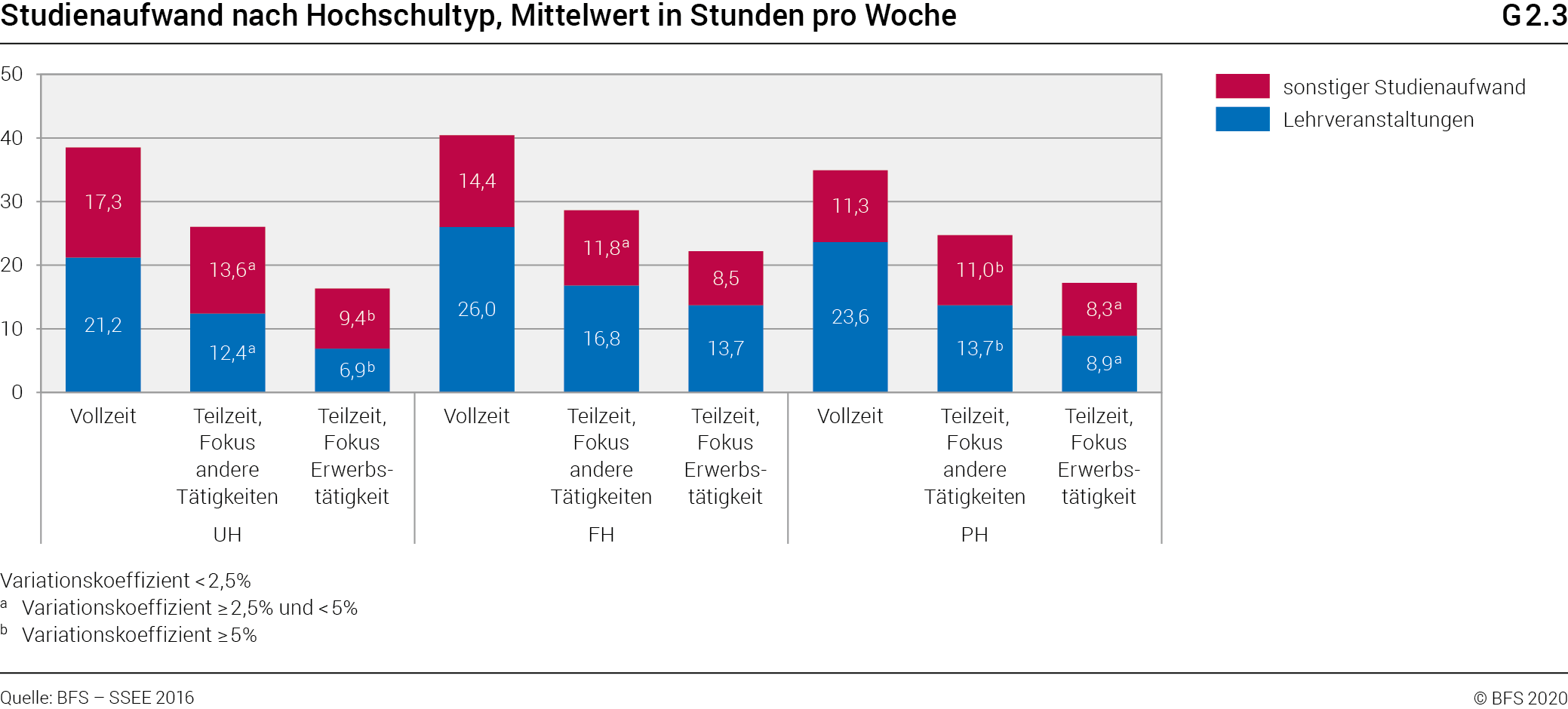 An den PH macht der Studienaufwand der Vollzeitstudierenden 34,8 Stunden aus. Davon fallen 23,6 Stunden auf Lehrveranstaltungen und 11,3 Stunden auf übrige mit dem Studium verknüpften Tätigkeiten. PH-Teilzeitstudierende mit Fokus andere Tätigkeiten verwenden mit 13,7 Stunden weniger Zeit für Lehrveranstaltungen als PH-Vollzeitstudierende. Hingegen benötigen sie mit rund 11 Stunden gleich viel Zeit für den sonstigen Studienaufwand wie PH-Vollzeitstudierende. PH-Teilzeitstudierende mit Fokus Erwerbstätigkeit wenden durchschnittlich weniger Zeit sowohl für den Besuch von Lehrveranstaltungen (8,9 Stunden) als auch für den sonstigen Studienaufwand (8,3 Stunden) auf als PH-Vollzeitstudierende. Der Zeitaufwand für Lehrveranstaltungen und für den sonstigen Studienaufwand hält sich somit bei ihnen die Waage.