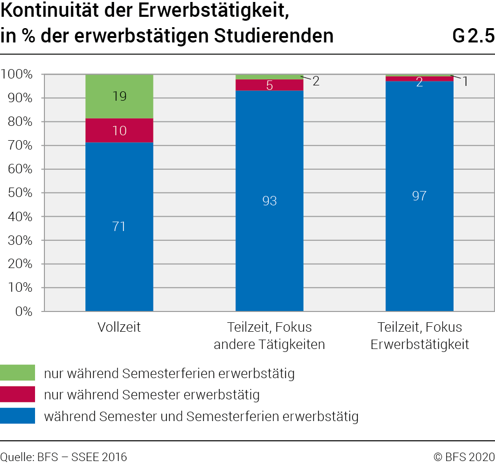 In Betracht gezogen werden die in den letzten zwölf Monaten vor der Erhebung ausgeübten regelmässigen oder unregelmässigen Erwerbstätigkeiten, inklusive bezahlte Praktika und Assistenzen. Nicht enthalten sind Erwerbstätigkeiten, die vor dem Studienbeginn stattgefunden haben. Der Beschäftigungsgrad bemisst sich anhand des durchschnittlichen Beschäftigungsgrades während der letzten zwölf Monate vor dem Erhebungszeitpunkt.
