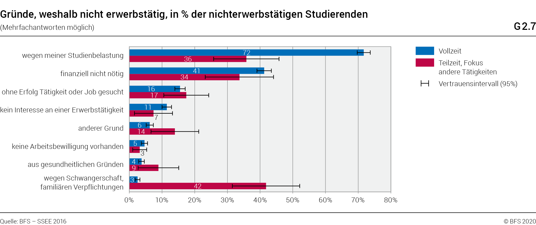Bei den Vollzeitstudierenden scheint die Studienbelastung mit einem Anteil von 72% die zentrale Hürde für eine Erwerbstätigkeit neben dem Studium zu sein. An zweiter Stelle nennen Vollzeitstudierende die Tatsache, dass eine Erwerbstätigkeit finanziell nicht erforderlich ist (41%). Bei den Teilzeitstudierenden mit Fokus andere Tätigkeiten sind die Ursachen für Nicht-Erwerbstätigkeit anders gelagert. So sagen 42% dieser Studierenden, dass sie infolge Schwangerschaft oder familiärer Verpflichtungen nicht erwerbstätig seien (gegenüber 3% bei den Vollzeitstudierenden). Mit einem Anteil von 36% steht bei den Teilzeitstudierenden mit Fokus andere Tätigkeiten die Studienbelastung erst an zweiter Stelle. Bei allen anderen Gründen lassen sich keine statistisch aussagekräftigen Unterschiede zwischen Teilzeit- und Vollzeitstudierenden feststellen.